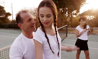 Horny trainer fucks duo of sexy slender girlies after super-cute tennis game