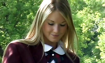 精致的学校少女构成诱人的色情户外独奏拍摄